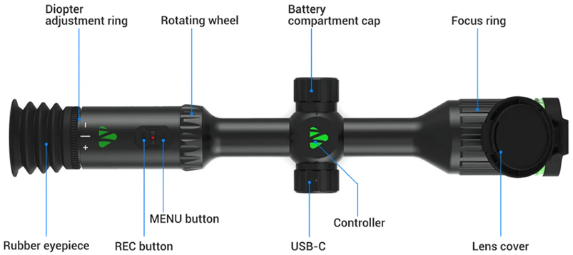 Night Arrow používá jedinečné otočné ovládací kolečko, které umožňuje rychlejší a přesnější ovládání přístroje. Jediným pohybem můžete plynule měnit zvětšení obrazu nebo procházet nabídky bez zbytečného zdržování. Díky tomuto praktickému systému je ovládání pohodlné, intuitivní a efektivní i během samotného sledování.
