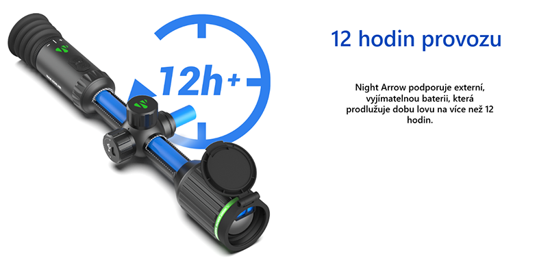 Night Arrow je vybaven výkonným zdrojem napájení, který v kombinaci s externí vyměnitelnou baterií umožňuje až 12 hodin nepřetržitého provozu. Díky tomu můžete přístroj používat po celou dobu lovu nebo dlouhého nočního pozorování bez obav z výpadku napájení. Externí baterii lze navíc rychle vyměnit, což prodlužuje celkovou dobu používání i v terénu.